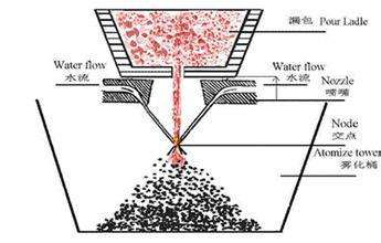 直接擊碎液體金屬或合金而制得粉末的方法稱之為霧化法,是生產規模僅次于還原法的、應用較廣泛的金屬粉末制取法。霧化粉末具有球形度高、粉末粒度可控、氧含量低、生產成本低以及適應多種金屬粉末的生產等優點,已成為高性能及特種合金粉末制備技術的主要發展方向,但生產效率低,超細粉末的收得率不高,能耗相對較大等缺陷限制了霧化法的應用。