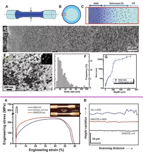 圖1 梯度納米Cu材料的微觀組織及其力學性能。A 拉伸試樣的示意圖;B和C拉伸實驗的橫截面部分,暗藍色為梯度納米層,藍色為粗晶變形層,青藍色為粗晶基體層;D為橫截面的SEM照片;E為橫截面的透射明場像;F表層5-mm深度中TEM測量的橫向粒度分布;G平均晶粒大小隨深度的變化(為粉線以上的圖);A粗晶銅和梯度納米晶銅準靜態拉伸工程應力-應變曲線;B:粗晶銅和梯度納米晶銅拉伸前后測量的表面高度變化曲線[1];