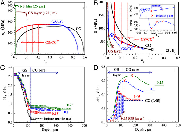 圖3 硬化速率上升以及額外的應變硬化. A 工程應力應變曲線,應變速率為5*10-4s-1.CG代表均勻的粗晶樣品;GS:代表梯度層,厚度約為120 μm:GS–CG:厚度為1mm的梯度-粗晶樣品。NS:納米金屬樣品. GS–CG+:在應變分別為0.05, 0.1, 0.15, 和 0.2的加載-卸載樣品. B 應變硬化速率-真應變曲線;C維氏顯微硬度(H) vs深度曲線;(D)不同拉伸應變后δ H (H增量)vs深度的曲線。