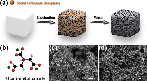 (a) 基于“原位自模板發(fā)泡”法的多孔碳合成工藝示意圖;