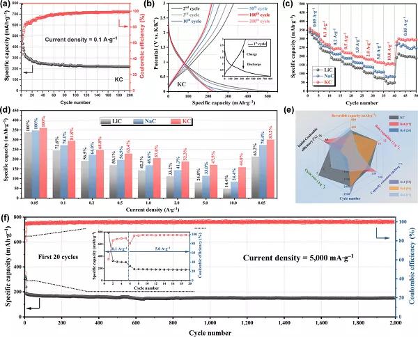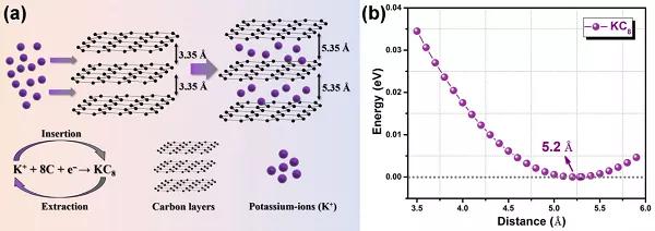 (a) K離子嵌入碳層間并形成穩(wěn)定的KC8化合物的示意圖;