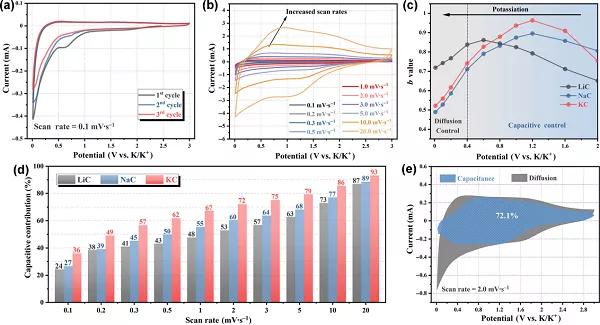 總結(jié)來說,研究人員提出了一種簡便的“原位自模板鼓泡”策略,用于合成層間調(diào)制的多孔碳。精心設(shè)計的層間和孔結(jié)構(gòu)工程使得所制備的電極具有出色的K離子存儲能力,優(yōu)于大多數(shù)已報道的材料,特別是在倍率性能方面。理論上,DFT計算結(jié)果揭示了層間距離與K離子擴散動力學(xué)之間的相關(guān)性,表明較大的層間距離對應(yīng)于更平滑的K離子擴散過程。實驗上,連續(xù)CV測量和非原位拉曼光譜的結(jié)果證實了擴散控制和電容性K離子存儲行為的共存。而且,主要的電容行為有助于提高速率能力和高可逆容量。總體而言,增大的層間距離提高了碳層之間的K離子的擴散速率,而分層的多孔結(jié)構(gòu)則促進了電容性K離子在邊緣、微孔和缺陷部位的吸附,這闡明了KC電極優(yōu)異的倍率能力的來源。此外,GITT測量驗證了KC電極在電池水平上增加的K離子擴散系數(shù),進一步表明了實際應(yīng)用前景。考慮到相關(guān)科學(xué)家的廣泛興趣,這項工作也可以擴展到類似的金屬-有機-鹽上,如葡萄糖酸鈣和海藻酸鈉。在關(guān)于科學(xué)內(nèi)涵的重要性上,對這項工作全面而深入的研究可以加深對構(gòu)建高性能PIBs和相關(guān)儲能裝置的微結(jié)構(gòu)控制碳材料的基本認識。