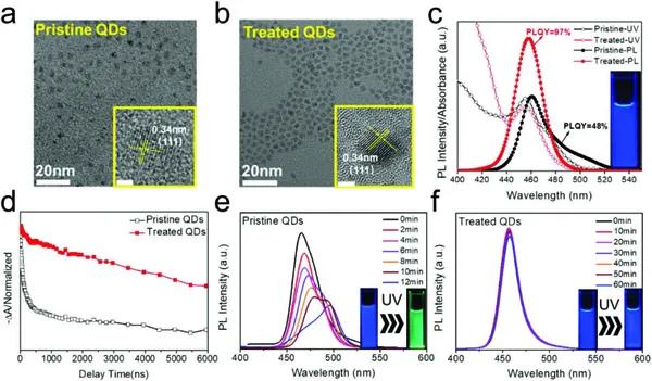 d)的瞬態吸收(TA,激發354 nm)漂白恢復曲線的演變,e)原始和f)處理的QDs在紫外線(UV)照射不同時間后的PL光譜。插圖:紫外線照射不同時間后的原始和經過處理的量子點的照片。