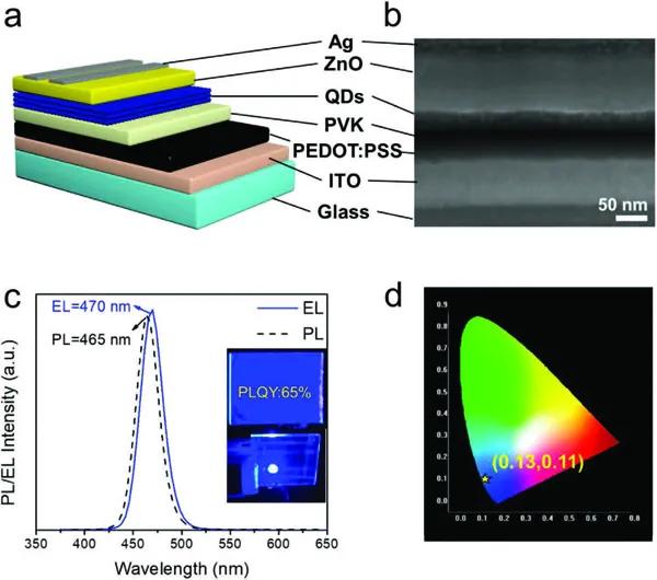 金屬鹵化物鈣鈦礦發光二極管(PeLEDs)因其熒光產率高、色域寬(≈140%)、發射峰窄等優點,成為超高清顯示的理想元件之一。近年,最先進的綠光和紅外光PeLEDs的外量子效率(EQE)超過20%,但是純紅光和藍光PeLEDs的亮度、EQE仍然很低。盡管天藍色PeLEDs(波長范圍:480-490nm)的EQE已經提升到10%以上,但這個波長范圍還不能滿足國家電視系統委員會(NTSC)標準純藍光(波長460-470 nm)的要求,這嚴重阻礙了PeLEDs在顯示技術中的應用。因此,設計滿足NTSC標準的高性能純藍PeLED仍然是一個尚未解決的挑戰。