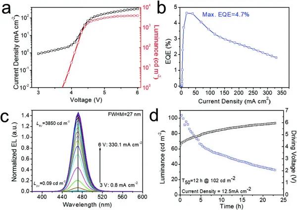 這項工作將酸蝕和配體交換結合起來,制備出高質量的純藍色發光鈣鈦礦CsPbBr3 QDs。強酸性HBr蝕刻了具有空位缺陷的不完美八面體,并從QDs中去除多余的羧酸鹽配體。然后,通過短支鏈DDDAM鏈和PEA物種之間的配體交換過程,隨后與QDs表面形成強的L型配位作用。這一策略顯著提高了QDs的穩定性,消除大量缺陷,獲得97%的量子熒光產率。基于該QDs的PeLEDs表現出純藍光發射(470nm)和4.7%的EQE,符合NTSC和Rec.2020標準,是一種理想的藍光發射。3850cd m-2的亮度和12小時的半衰期也是迄今為止所報道的純藍光PeLEDs的最高亮度和穩定性表現。因此,這一策略為推動PeLEDs的發展和應用提供了一種途徑。