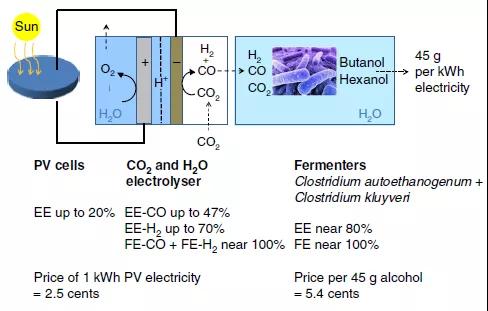 針對這一問題,德國西門子公司的Guenter Schmid(通訊作者)團隊[1]利用了可商用的銀基氣體擴散電極。該電極通常使用在工業規模的氯-堿電解過程中,而研究人員則以此電極作為二氧化碳電解槽的陰極。檢測發現,由此形成的電解槽在超過1200小時的連續運行后,電流密度依然可高達300?mA cm–2。這一二氧化碳電解槽可被連接到發酵模塊(fermentation module),這樣一來,從電解槽出來的合成氣可以直接轉化成具有高碳選擇性的丁醇和己醇。研究計算顯示。光伏電能、二氧化碳和水轉變成醇類的法拉第效率可接近達到100%。利用這一雜化系統,研究表示人工光合成高價值化學品(丁醇/己醇)可能達到幾萬噸每年的產量,已經接近工業化規模水平。