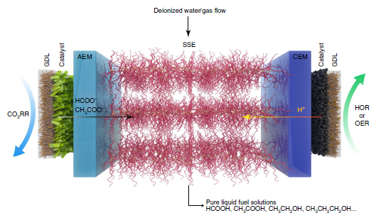 萊斯大學的汪淏田(通訊作者)團隊[2]利用固態電解質在電池中實現了二氧化碳連續電催化轉化生成純液體燃料溶液。在這個過程中,電化學產生的陽離子(如氫離子)和陰離子(如甲酸根離子)相互結合形成不含其他離子的純產物溶液。在陰極上利用甲酸選擇性(法拉第效率大于90%)和極易規模化的鉍催化劑,研究證實了該過程可生產濃度達12M的純甲酸溶液。研究也展示了長達100小時的0.1M甲酸的連續穩定生產,同時催化選擇性和活性幾乎不變。同樣地,利用銅催化劑,研究還實現了如醋酸等其他無電解質液體產物。這一工作在可規模化電池上實現了二氧化碳電催化直接還原成甲酸的過程,展示了二氧化碳電還原的工業化前景。