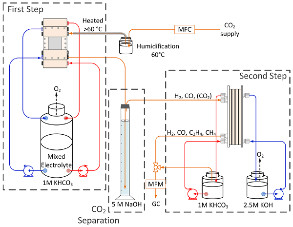 而近期,西門子公司的N. S. Romero Cuellar(通訊作者)等人[7]提出了一種新型的兩步電解法,展示了其工業化前景。作者利用兩塊分別以銀和銅作為氣體擴散電極的液流電池,將兩步二氧化碳電化學還原過程進行集成化。在這一集成系統中,作者實現了電解質、氣體和電極之間的巨大三相邊界區域,由此可以在工業級電流密度水平操作運行電化學還原過程。作者首先利用電壓/電流密度變化線掃分別研究兩個電解槽;而在分析第二個電解槽時,作者假定供應第一步的二氧化碳不會全部轉化成一氧化碳,即第一步的產物氣體是一氧化碳/二氧化碳的混合氣。以此假定,作者研究了不同比例混合氣的電還原反應,并發現二氧化碳的占比越高一氧化碳轉換成多碳產物的效率越低。因此,作者在第二步中用氫氧化碳吸附二氧化碳,從而有效增加集成系統的全局法拉第效率。根據計算,這一兩步策略的多碳產物(C2和C3)累計法拉第效率可以達到62%。
