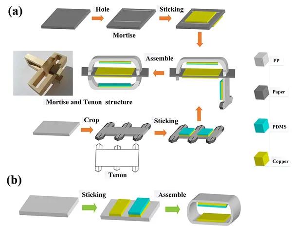 通過對中國傳統榫卯工藝的深入研究,利用廢棄紙張和聚丙烯(PP)材料,構建了一種新型的榫卯結構摩擦納米發電機(MT-TENG),這種新結構可以實現高度的堅固性和空間分割。