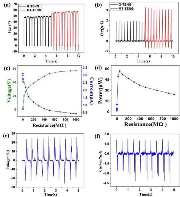 (a,b)在相同條件下,測量了G-TENG和MT-TENG的開路電壓、短路電流;(c)輸出電壓與電流與MT-TENG負載電阻的關系;(d)輸出功率密度與MT-TENG負載電阻的關系;(e,f)50MΩ MT-TENG的輸出電壓和電流。