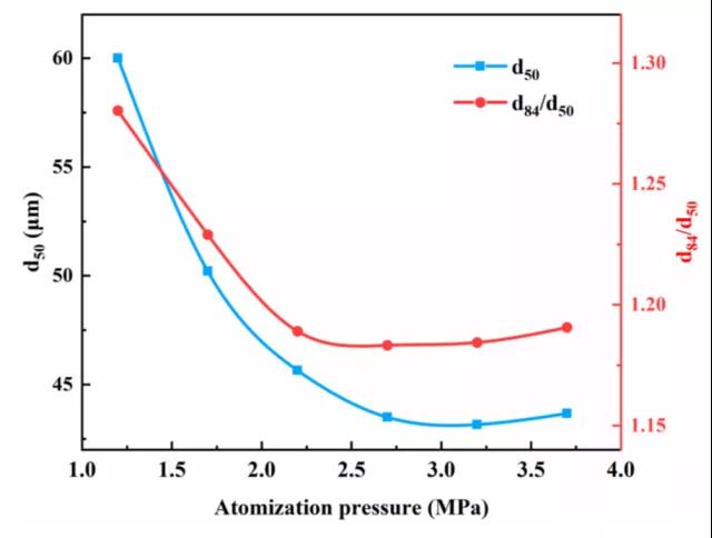 由公式可以看出,在霧化器結構和工藝參數確定地情況下,粉末的粒度只與金屬熔體的動力黏性系數 μm、金屬熔體的表面張力σm 以及金屬熔體的密度 ρm 有關。