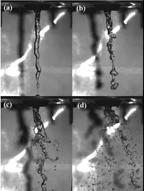 高速攝影拍攝的結果可保存為視頻文件,利用 Adobe Premiere Pro 軟件,可將視頻中每一幀圖像提取出來,選擇其中典型的霧化圖像可以對霧化過程進行分析。以氣體壓力為1.7MPa, 液體流量為 60L/h 為例, 提取出一系列圖片, 如圖 4所示。