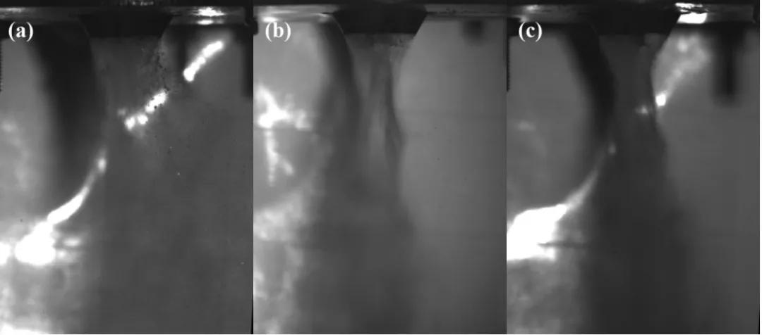 在霧化氣體壓力達到預定值并穩定后, 形成的霧化流場也會變得穩定, 液體破碎的機理和程度都不隨時間改變。如圖 5 所示, 為不同霧化氣體壓力下, 霧化流場穩定后的圖像。圖 5 中的 (a)、(b)、 (c) 分別為霧化氣體壓力為 1.7MPa、 2.2MPa、2.7MPa 時的霧化流場圖像。