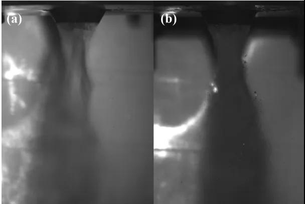 圖 7 不同液體流量時的霧化流場圖像:(a) Q=60L/h; (b)Q=120L/h