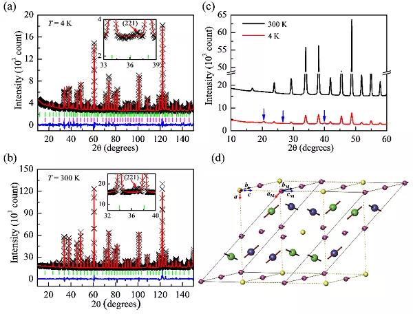 圖2 CaCu3Fe2Ta2O12在(a) 4 K和(b) 300 K時(shí)的中子衍射精修圖,(c) 4 K和300 K的低角度的中子衍射數(shù)據(jù),其中藍(lán)色箭頭表示核衍射和磁衍射之間的差異。(d) CaCu3Fe2Ta2O12在4 K時(shí)的磁結(jié)構(gòu)。其中虛線坐標(biāo)軸表示晶格基矢量(a,b,c),實(shí)線坐標(biāo)軸表示磁基矢量(aM,bM,cM)。