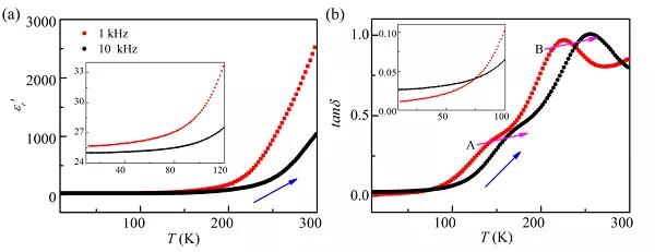 圖3 CaCu3Fe2Ta2O12在1 kHz和10 kHz時(shí)(a) 介電常數(shù)和(b) 介電損耗的溫度依賴性。