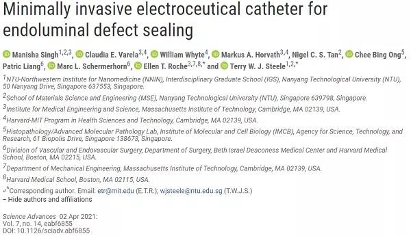 腔內缺損的外科手術修復與圍手術期發病率和死亡率有關。利用組織粘合劑進行血管內修復可以減少宿主組織損傷,但是目前的生物粘合劑設計不支持微創部署。其中,電壓激活的組織粘合劑為腔內修復提供了一種新的策略。為了促進電壓激活粘合劑的臨床轉化,新加坡南洋理工大學Terry W. J. Steele和麻省理工學院Ellen T. Roche(共同通訊作者)等人報道了將一種電壓激活貼片(ePATCH)與一種帶有可拉伸電極的微創導管(CATRE)配對,以對抗體內和體外管腔缺陷的修復。ePATCH/CATRE平臺展示了在濕組織基底上密封直徑高達2 mm的管腔缺損。防水密封件具有柔韌性和回彈力,可承受20000多次生理相關的應力/應變循環。當心臟跳動時,ePATCH被電激活,沒有觀察到電信號中斷。ePATCH/CATRE平臺具有廣泛的潛在應用,從假性動脈瘤/瘺的血管內治療到生物電極,再到電生理標測。