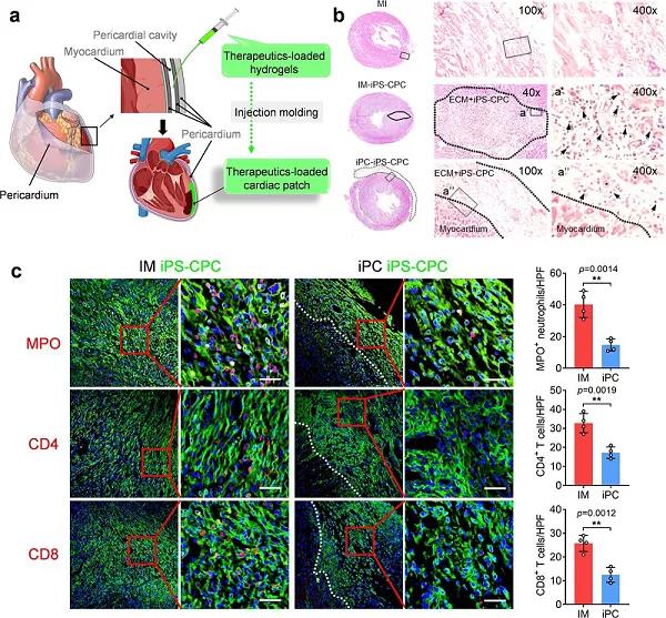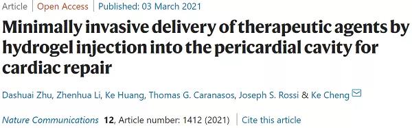 心臟貼片是一種向心臟遞送治療藥物的有效方法。然而,這種手術通常是侵入性且很難進行的。基于此,美國北卡羅萊納州立大學Ke Cheng(通訊作者)等人開發并測試一種方法,利用心包腔作為一個自然模型,在心包內注射生物相容性水凝膠中的治療藥物后原位形成心臟貼片。在嚙齒類動物心肌梗死模型中,作者證明了心包內注射是一種有效且安全的方法來遞送含有誘導多能干細胞衍生的心臟前體細胞或間充質干細胞來源的外泌體的水凝膠。在注射后,水凝膠在心包腔形成心臟貼片狀結構,減輕免疫反應,增加治療藥物的心臟滯留時間。通過強大的心血管修復和心外膜源性細胞的刺激,遞送的治療減輕心臟重構和改善心肌梗死后心臟功能。此外,作者在臨床相關的豬模型上證明了微創心包內注射的可行性。總之,該研究證實了心包內注射是一種安全有效的方法,可以將治療性水凝膠遞送到心臟進行心臟修復。