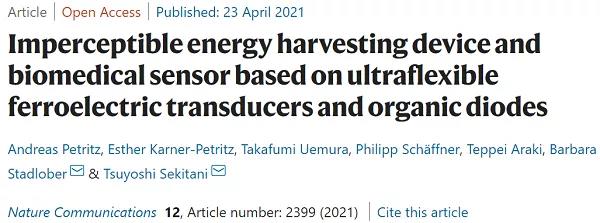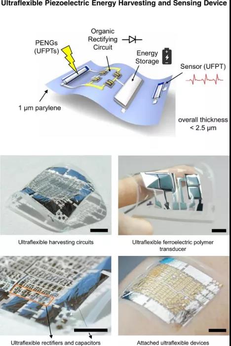 能源自主性和整合性是下一代可穿戴和柔性電子產品的基本要素,用于醫療保健、機器人和信息物理系統。基于此,日本大阪大學Tsuyoshi Sekitani和奧地利Barbara Stadlober(共同通訊作者)等人首次報道了一種由壓電納米發電機、二極管整流器和儲能電容組成的綜合性超柔性能量收集器件(UEHD),所有組件的厚度均不超過2.5 μm,在僅1 μm的聚對二甲苯制成的薄基板上制成。當附著在人體皮膚的表面上時難以察覺,作者展示了一種鐵電無線電子保健貼片,可以監測脈搏率并測量血壓。納米發電機和傳感器都是基于P(VDF:TrFE)70:30的超柔性鐵電聚合物傳感器(UFPTs)。同時,結合了由有機二極管制成的超柔性全波整流器電路,具有短OTFT幾何形狀和超柔性薄膜電容器使用納米氧化鋁薄層。作者采用DNTT(二萘并噻吩)作為有機半導體的二極管顯示出很高的整流比,超過107,并且由于它們的過電壓低于100 mV,因此內置的電壓降可忽略不計。其中,UFPTs具有以下優點:(1)超柔韌性,使其能夠共形附著于各種材料和表面,并允許將多層UFPTs堆疊在3D形狀的載體上;(2)對平面外(橫向)應力的高靈敏度,可通過多層堆疊提高,從而實現預彎曲橡膠載體上三層堆疊的峰值靈敏度在15 nC N-1范圍內;(3)極好的機械穩定性,允許在40 μm彎曲半徑下穩定運行;(4)響應時間非常短,遠低于20 ms N-1。此外,UFPTs用作脈沖電源時,峰值功率密度超過3 mW cm-3。