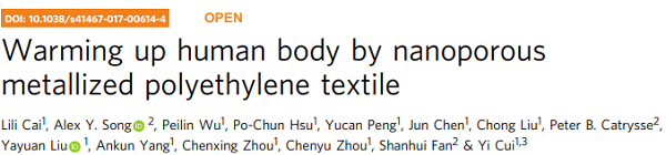 3. 斯坦福大學崔屹Nat. Commun.: 保溫利器-納米多孔金屬化聚乙烯織物