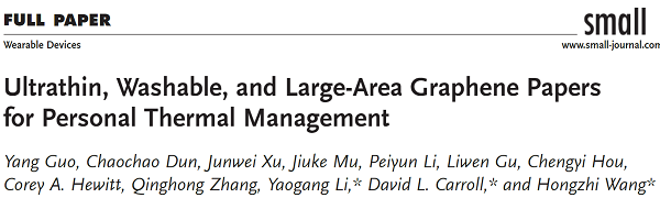 5. 維克森林大學David Carroll &東華大學王宏志Small封面: 用于個人熱管理的超薄、可水洗和大面積石墨烯紙