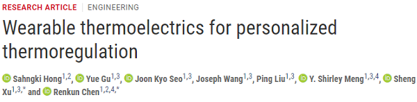 7. 加州大學圣地亞哥分校陳仁坤&徐升Sci. Adv.: 用于個性化溫度調節的可穿戴熱電設備