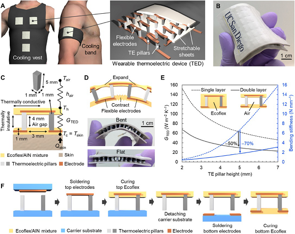 體溫調節對能量消耗以及人類舒適和健康具有重要的影響。然而,一個多世紀以來,冷卻技術基本保持不變,而且無論居住人數的多少,仍然依賴于對整個空間進行制冷。熱電裝置(TED)的個性化溫度調節可以顯著減少冷卻量并滿足個性化的冷卻需求,但由于缺少具有可持續的高冷卻性能的柔性TED,目前還沒有實現。本文中,加州大學圣地亞哥分校陳仁坤&徐升等研究者展示了一種可穿戴TED,它可以提供超過10 °C的冷卻效果,并具有高性能系數(COP > 1.5)。由于在雙彈性體之間加入剛性無機高熱電優值(ZT)的熱電(TE)柱,以及空氣絕緣絕熱層的新穎設計,該TED是第一個實現長期高柔性主動冷卻的產品。此外,該TED在沒有使用其他散熱器的情況下,可以達到10 ℃以上的降溫效果。該研究還將TED集成到了一件可穿戴的衣服中,展示了其對人體皮膚的長期、節能的降溫和加熱效果,研究結果表明:當環境溫度在22 ℃到36 ℃之間變化,該衣物可保持人體皮膚在32 ℃的舒適溫度。與傳統的集中空間冷卻方式相比,TED自動化的冷卻能力為個性化冷卻提供了巨大的節能潛力,從而在提高人體舒適度的同時大大降低能源消耗。