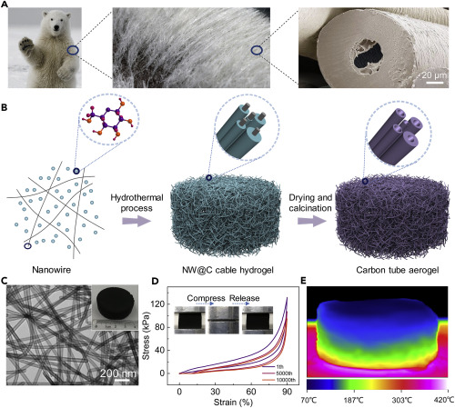 北極熊中空、輕質且不可潤濕的毛發有助于其抵御極端寒冷的環境。受北極熊毛發微觀結構的啟發,中科大俞書宏院士團隊采用一維納米線作為模板,通過模板法制備宏觀尺度的具有超彈性和出色隔熱性能的輕質碳管氣凝膠(CTA),這種材料具有了北極熊毛發的所有優點,包括輕質、防水和隔熱性。這種由中空碳纖維管組成的CTA重量輕,最低密度僅為8 kg/m3,并且具有146 °接觸角的優異防水性能。同時,CTA 的最低熱導率僅為 23 mW·m-1·K-1,優于干燥空氣。值得注意的是,仿生 CTA 材料顯示出比北極熊毛更好的超彈性和抗疲勞性,優化后的氣凝膠可以在 30% 應變下超過 100 萬次壓縮-釋放循環和 90% 應變下超過 10,000 次循環后保持結構完整性。通過標準鋼球下落測試,其回彈速度達1,434 mm/s,進一步證實了其超彈性。這種碳管氣凝膠宏觀合成的仿生設計為未來設計高性能輕質、超彈性和隔熱材料打開了一扇窗,可廣泛應用于仿生工程材料領域,如建筑、 航天等。