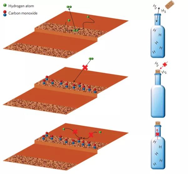 氫溢流是各種加氫反應(yīng)中常常存在的實(shí)驗(yàn)現(xiàn)象,指的是原本無法解離H2的位點(diǎn)吸附了H,這個(gè)位點(diǎn)上的H就說從能夠解離H2的位點(diǎn)溢流過來的。Sykes教授利用這種現(xiàn)象設(shè)計(jì)了一個(gè)很有意思的實(shí)驗(yàn)[7]。他們把Pd單原子負(fù)載在Cu表面。這時(shí)候Pd能夠解離H2,并且對(duì)CO具有很強(qiáng)的吸附能力;Cu表面無法解離H2,只能吸附解離后的H原子,并且對(duì)CO吸附能力弱。由于反應(yīng)的可逆性,H2也只能在Pd表面脫附而無法在Cu表面脫附。他們先通H2,H2在Pd單原子上解離,并溢流到Cu表面;再通CO,這時(shí)候CO會(huì)吸附在Pd單原子上,將其毒化。當(dāng)升溫時(shí),只有CO脫附之后,才會(huì)開始脫附H2。