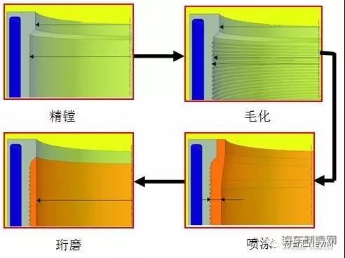 通過與國外噴涂廠家的交流,我們試制了噴涂缸體,掌握了等離子噴涂的工藝流程:缸孔精鏜—缸孔毛化—清洗—缸孔噴涂—過噴涂處理—最終珩磨。在此,對噴涂工藝的關鍵工序(見圖2)展開分析。