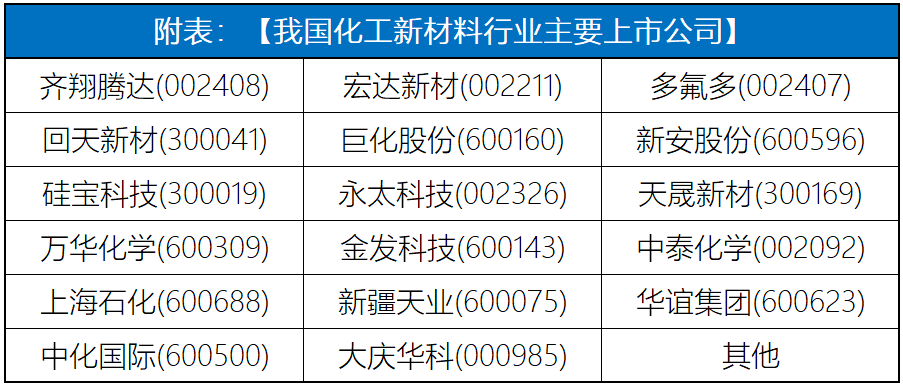 以化工新材料為例,“十三五”期間,行業得以快速發展,部分行業短板得到補足。當前中國化工新材料市場呈現總體競爭格局松弛與局部龍頭壟斷并行的局面,未來行業發展區域化趨勢仍將持續。當前形成局部壟斷的化工新材料主要以大型國有企業為主,少量中石化集團所屬的中小型國有企業表現不俗,數十家上市企業競相發展(附上市公司清單)。這些企業因其進入時間較早、積累了一定的行業經驗、形成完整的產業基礎、裝置、技術、人才儲備充分,同時也具有完整的產品鏈及管理規范。