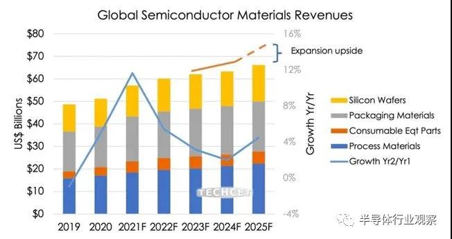 在全球轟轟烈烈進行“造芯運動”的時候,作為芯片制造所需的材料市場也在極致旺盛的產業需求之下不斷成長。據TECHET在8月30日發布的統計分析數據,2021年世界半導體材料市場將超過570億美元,同比將增長11.8%;預計到2025年約為660億美元,半導體材料市場銷售額平均復合增長率約為5.3%,增長最快的材料為硅晶圓、清洗材料、CMP材料和光刻膠。