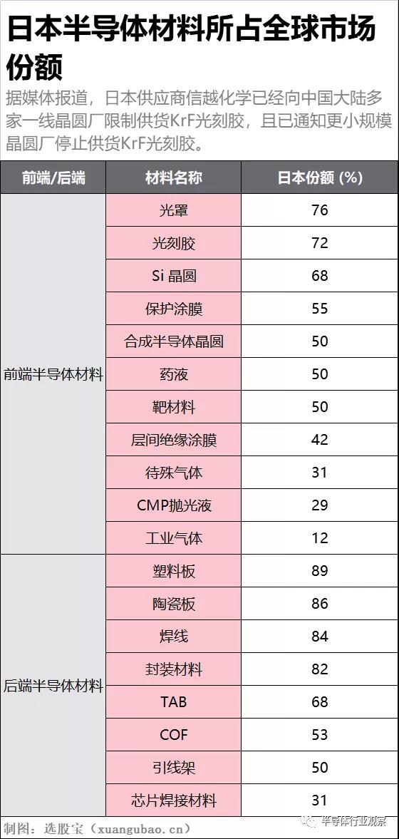 此外,日本在光罩、保護涂膜、封裝材料以及引線架等14種重要材料方面,均占有50%以上的市場份額。