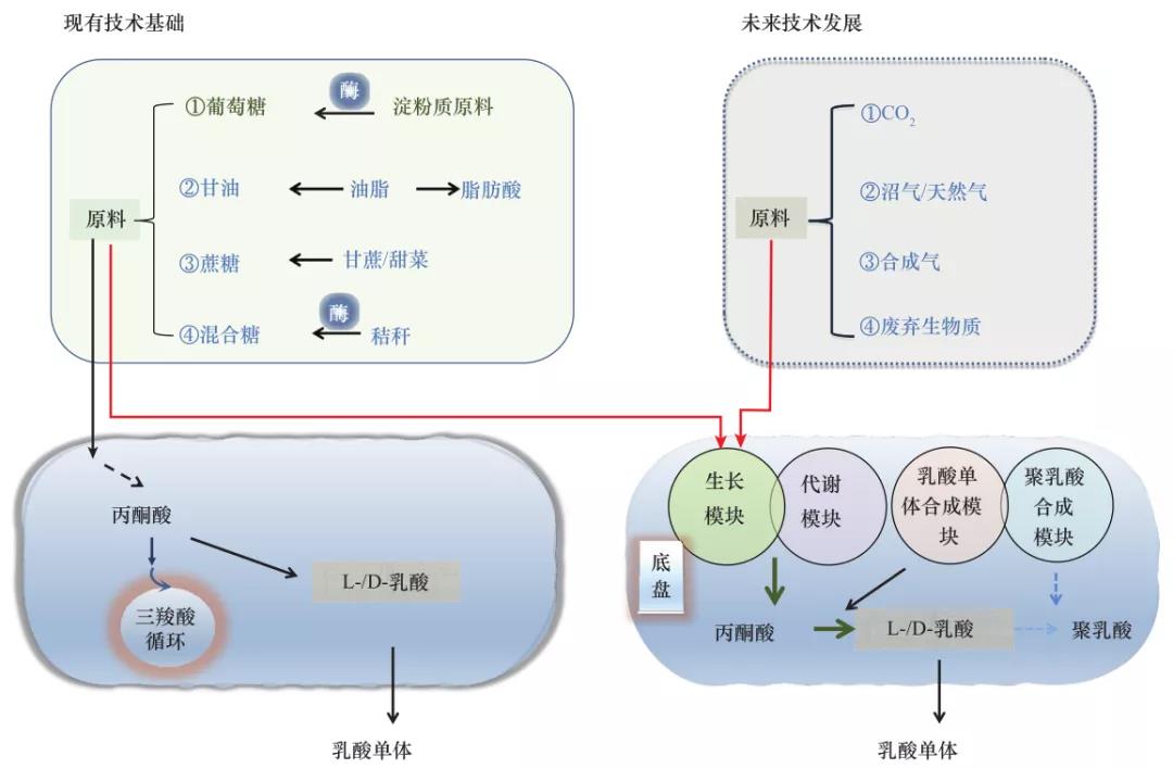 其他可能的乳酸單體生產(chǎn)原料。在分子克隆技術(shù)發(fā)明 50 年后、人類基因組計劃實施 30 年后的今天,對選定出發(fā)菌株的特定基因和 / 或全基因組修飾與精細(xì)調(diào)整已經(jīng)成為現(xiàn)實,這將賦予生產(chǎn)菌株以更好的原料利用屬性和生產(chǎn)屬性。因此,合成生物學(xué)技術(shù)為未來聚乳酸生產(chǎn)提供了全新的可能性:通過底盤生物的創(chuàng)制、分子遺傳模塊(如生長繁殖模塊、特殊代謝模塊、乳酸單體合成模塊、聚乳酸合成模塊)的優(yōu)化組合,有可能利用廢棄生物質(zhì)、沼氣、天然氣、合成氣、CO2 等,為直接原料生物合成乳酸單體甚至直接生物合成聚乳酸(見圖 2)。