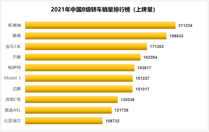 迄今為止,漢不僅僅是比亞迪最重要的一款車,也是中國自主品牌歷史上具有里程碑意義的一款車。2021年,按照工信部的上牌數據,比亞迪漢以10.87萬輛的上牌量,沖進了中國B級轎車銷量排名榜的前十,排在這個榜單前面的,都是老牌的外資釘子戶,凱美瑞、雅閣,寶馬3……