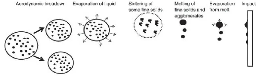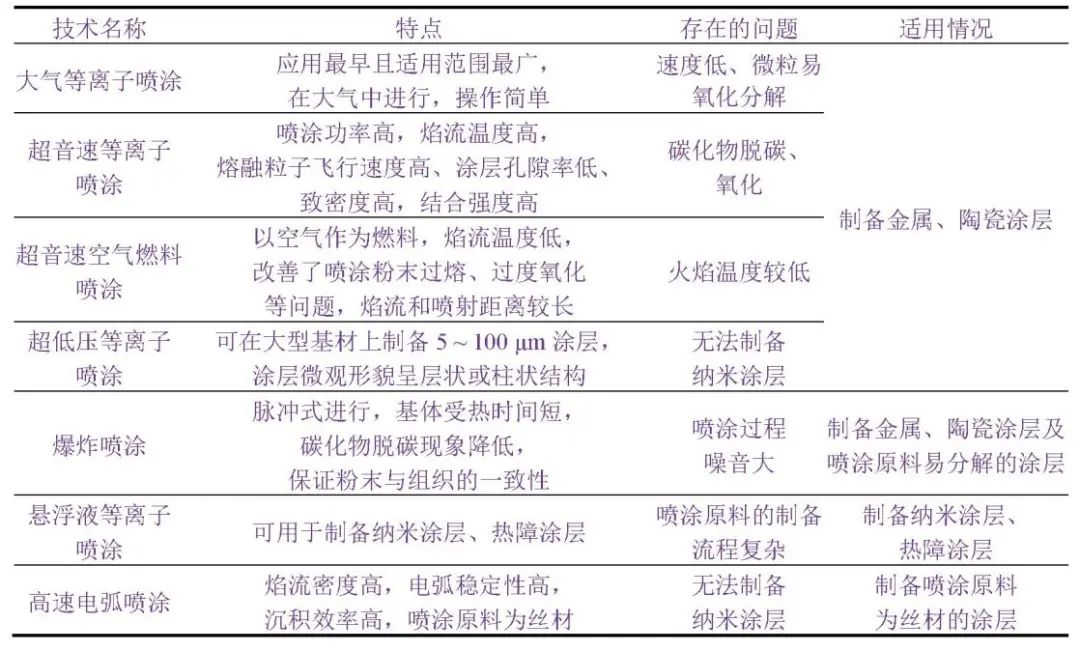 影響熱噴涂涂層性能的主要因素是原料在噴涂焰流中的熔融狀態(溫度)和飛行速度(微粒的動能)。在大氣等離子噴涂之后出現的各種熱噴涂技術,無一不是通過提高微粒溫度或速度來獲得性能優異的涂層。此外,由于等離子噴涂、爆炸噴涂等技術無法使用納米粉體進料,在制備納米結構涂層時只能通過造粒將其制為微米級粉體用于噴涂,噴涂工藝和涂層性能均受到限制。因此,研究人員還開發了懸浮液等離子噴涂(SSPS),以便獲得特定組織的納米結構涂層。