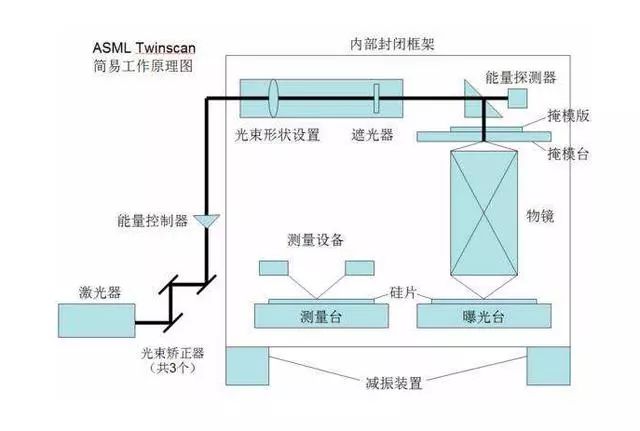 在光刻技術(shù)的原理下,人們制造了光刻機,光刻機通過一系列的光源能量、形狀控制手段,將光束透射過畫著線路圖的掩模,經(jīng)物鏡補償各種光學(xué)誤差,將線路圖成比例縮小后映射到晶圓上,不同光刻機的成像比例不同,有5:1,也有4:1。然后使用化學(xué)方法顯影,得到刻在晶圓上的電路圖(即芯片)。