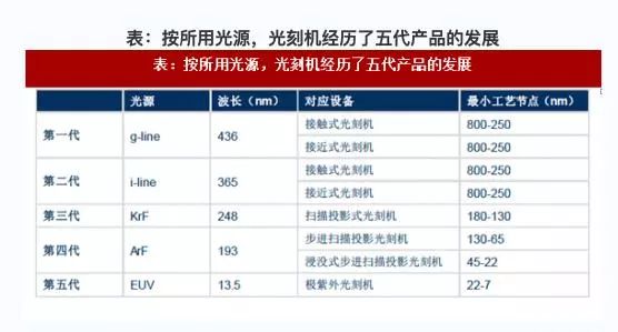 根據(jù)所使用的光源的改進(jìn)以及雙工作臺、沉浸式光刻等新型光刻技術(shù)的創(chuàng)新與發(fā)展,光刻機經(jīng)歷了 5 代產(chǎn)品的發(fā)展,每次光源的改進(jìn)都顯著提升了升光刻機的工藝制程水平,以及生產(chǎn)的效率和良率。