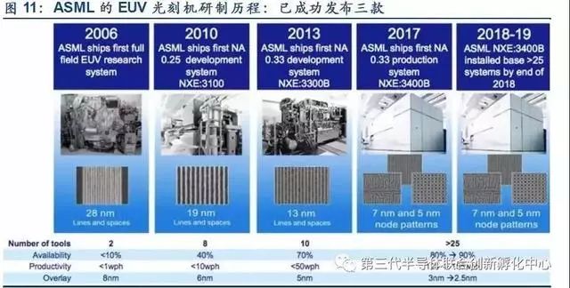 光刻機龍頭企業(yè) ASML 從 1999 年開始 EUV 光刻機的研發(fā)工作,原計劃在 2004 年推出產(chǎn)品。但直到 2010 年 ASML 才研發(fā)出第一臺 EUV 原型機, 2016 年才實現(xiàn)下游客戶的供貨,比預(yù)計時間晚了十幾年。直到2019年,第一款7nm EUV 工藝的芯片 Exynos 9825 才正式商用。