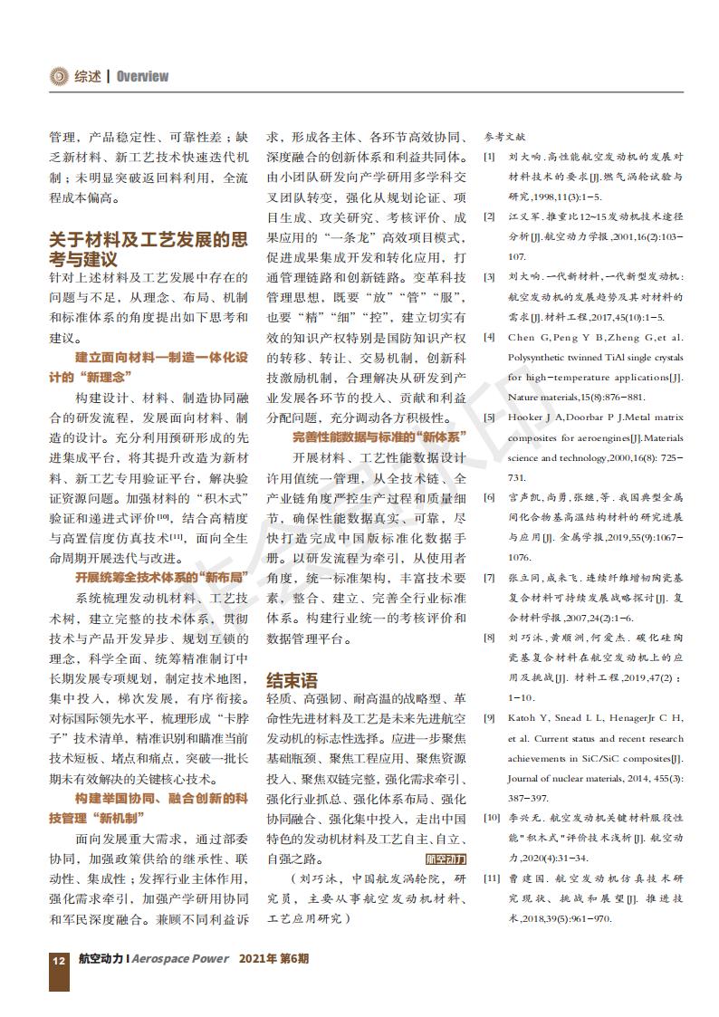 航空發(fā)動(dòng)機(jī)對(duì)材料、工藝有著極其嚴(yán)苛的要求。材料、工藝在某種程度上決定了發(fā)動(dòng)機(jī)的性能和特性。發(fā)動(dòng) 機(jī)推重比的提高將更加依賴輕質(zhì)、高強(qiáng)韌、耐高溫的戰(zhàn)略型、革命性先進(jìn)材料及工藝。