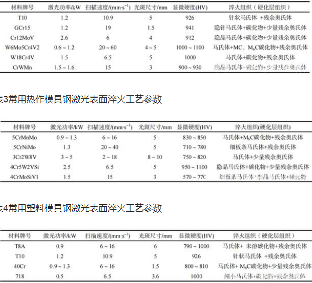 采用激光淬火技術對模具處理時,通常根據模具的形狀特點和使用要求在指定區域內進行淬火。激光淬火后,模具表面的耐磨性較常規淬火、回火處理有顯著提高,從而延長了模具的有效使用時間。例如福建農林大學徐洪煙等研究了經激光淬火后模具材料的性能變化,結果表明,模具表面組織的改變使其耐磨性增強,淬火后的殘余應力也使 模具材料的抗疲勞性顯著提高。樊湘芳等對 GCr15 鋼沖模的母模進行了激光表面淬火,試驗后,其表面硬度獲得提高,增強了母模型腔的抗沖擊能力,使模具壽命提高了 20%以上。常見的模具有冷作模、熱作模及塑料模,對于不同材料的模具, 經激光淬火后,組織性能有所不同。用于加工的冷作模具材料都屬于高碳鋼,提高耐磨性和硬度是表面淬火的主要目的。經激光淬火后的組織和性能見表 2。用于加工的熱作模具材料都屬于中碳鋼,表面淬火的目的有提高高溫耐磨性、耐熱疲勞性、抗氧化性,但是并不要求很高的表面硬度。經激光淬火后的組織和性能見表3。 用于加工的塑料模具材料范圍較廣,從結構鋼到工具鋼,從碳素鋼到合金鋼。塑料模具對其表面的粗糙度要求很嚴格,但不要求很高的表面硬度, 因此激光表面淬火處理多用于一些囊塊,其目的是提高囊塊的硬度。經激光加熱表面淬火后的組織和性能見表4。