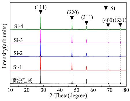 對(duì)四組工藝制備的 Si 粘結(jié)層和噴涂硅粉的相組成進(jìn)行了 XRD 分析, 結(jié)果如圖 3 所示。對(duì)比涂層和噴涂硅粉圖譜, 可以看出噴涂態(tài)涂層與噴涂硅粉的 X 射線衍射峰峰位沒有出現(xiàn)漂移, 相組成相同, 說明在 Si 粘結(jié)層制備過程中沒有出現(xiàn)雜質(zhì)相。