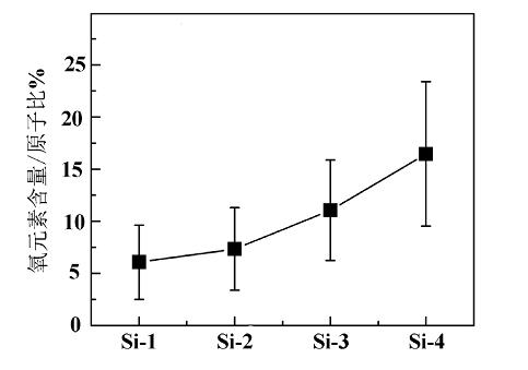 采用 Metco 4810 粉末在噴涂距離為 90 mm、噴槍移動(dòng)速率為 500 mm/s、 噴涂電流為 350 A、400 A、 500 A 和 600 A 的條件下制備的 Si 粘結(jié)層組織形貌如圖4 所示。四組工藝參數(shù)對(duì)應(yīng)的低倍背散射形貌分別為圖4(a)、 圖 4 (c)、 圖 4 (e) 和圖4 (g), 能夠觀察到涂層表面熔融狀態(tài)和顆粒堆積緊密程度。Si-1 和 Si-2 涂層表面中較大顆粒多于Si-3 和 Si-4 涂層, 這是由于隨著噴涂電流的增大,粉末粒子熔融更充分。四組工藝參數(shù)對(duì)應(yīng)的高倍二次電子形貌分別為圖 4 (b)、 圖 4 (d)、 圖 4 (f) 和圖4 (h), 噴涂電流為350 A的Si-1涂層放大形貌(圖4(b)) 表面能觀察到與 Si 粉( 圖 1 (a)) 類似的規(guī)則形狀顆粒, 表明該條件下部分顆粒未熔化充分;更高噴涂電流制備涂層(圖 4 (c)、 (e)、 (g)) 中,粉末粒子熔化充分, 扁平化程度更高。在高倍的二次電子形貌圖 4(b)、 圖 4(d)、 圖 4(f) 和圖 4(h)中顯示了在微米尺度下涂層粗糙的表面狀態(tài), 四組不同工藝的涂層表面都很粗糙, 凹凸不平。涂層放大形貌中均存在納米尺寸的白色顆粒, 隨著噴涂電流增加, 白色的微粒增多。推測(cè)該白色顆粒應(yīng)該是 Si 氧化形成的, 在 300 倍二次電子形貌下,選擇表面比較平坦的區(qū)域取 7 個(gè)點(diǎn)進(jìn)行 EDSpoint 分析,僅選擇硅和氧兩種元素進(jìn)行對(duì)比, 繪制了四種工藝涂層表面的氧含量如圖 5 所示。從圖 5 中可以看出, 隨著噴涂電流的增大, 涂層表面含氧量升高, 表面氧化加重。