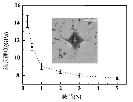 基于前面幾部分對(duì) Si 粘結(jié)層涂層相組成、 形貌和結(jié)合強(qiáng)度分析, 涂層表面粗糙度、 粉體的熔融情況、 涂層表面的氧含量和孔隙率都隨噴涂電流有規(guī)律的變化, 但是 Si-2 組(噴涂電流為 400 A)涂層結(jié)合強(qiáng)度高于其他三組工藝。對(duì) Si-2 組的涂層表面進(jìn)行拋光, 采用全自動(dòng)硬度計(jì)進(jìn)行硬度測(cè)量, 載荷分別為 25 g、 50 g、 100 g、 200 g、 300 g和 500 g, 基于測(cè)量的數(shù)據(jù)繪制了不同載荷下硬度對(duì)比圖, 將對(duì)應(yīng)的硬度平均值用虛線連接, 形成
