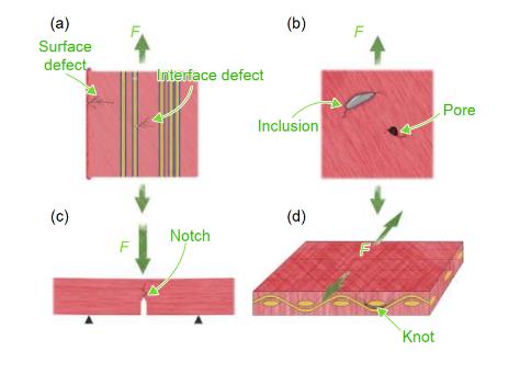 SiC/SiC 復合材料從損傷發生到最終破壞主要經歷基體橫向開裂、層間開裂、纖維束與基體分離、纖維束內基體開裂、纖維斷裂與拔出等損傷模式。裂紋萌生、擴展直至發生破壞的方式同纖維預制體結構或鋪層方式、界面層的類型及其與纖維和基體的結合強度、基體缺陷等密切相關。表面和界面缺陷、內容物和孔洞、人工狹縫或缺口尖端、編織結節等應力集中部位容易成為裂紋萌生點,如圖 2 所示。由于缺陷的廣泛存在,基體裂紋往往在比例極限以下即可發生;但是在很低應力水平下發生的基體裂紋并不一定直接影響材料的性能。