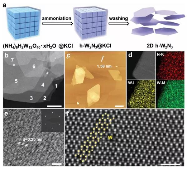 2D過渡金屬氮化物,尤其是富氮的氮化鎢(WxNy,y>x),例如W3N4和W2N3,由于大量的W-N大大提高了催化活性,具有很大的產氫反應(HER)潛力。但是,由于W-N鍵的形成能量大,因此合理合成2D富氮氮化鎢具有挑戰性。本文中,通過鹽模板法在大氣壓力下合成了超薄的2D六角形W2N3(h-W2N3)薄片。