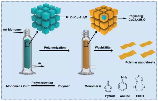 2D過渡金屬氮化物,尤其是富氮的氮化鎢(WxNy,y>x),例如W3N4和W2N3,由于大量的W-N大大提高了催化活性,具有很大的產氫反應(HER)潛力。但是,由于W-N鍵的形成能量大,因此合理合成2D富氮氮化鎢具有挑戰性。本文中,通過鹽模板法在大氣壓力下合成了超薄的2D六角形W2N3(h-W2N3)薄片。由于KCl和h-W2N3之間的強相互作用和疇匹配外延,h-W2N3的形成能可以大大降低。2D h-W2N3對陰極HER表現出出色的催化活性,起始電勢為-30.8 mV,對于10 mA/cm2,其超電勢為-98.2 mV。Atmospheric-Pressure Synthesis of 2D Nitrogen-Rich Tungsten Nitride.(Adv. Mater., 2018, DOI:10.1002/adma.201805655)2.J. Mater. Chem. A:通過鹽模板方法大規模合成可調節尺寸和厚度的導電聚合物納米片