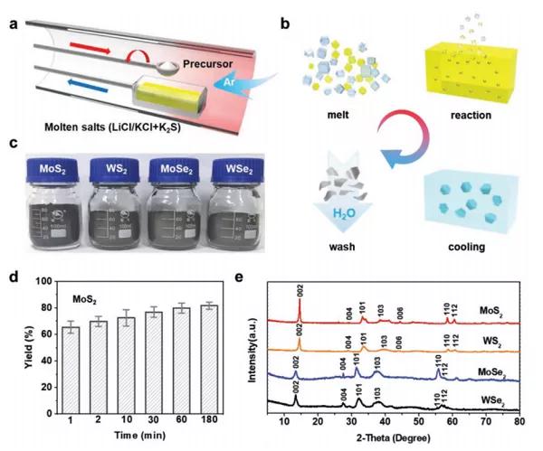 2D過渡金屬二硫化碳(TMD)由于其厚度相關的化學和物理特性而非常適合于能量存儲和場效應晶體管。但是,由于當前的二維TMD合成方法無法兼具液相合成和化學氣相沉積的優點,因此仍然對大規模生產仍然是巨大的挑戰高質量的2D TMD。在此,報道了一種熔融鹽方法,該方法可大規模合成厚度小于5 nm的各種高結晶度TMDs納米片(MoS2,WS2,MoSe2和WSe2),產率超過68%,反應時間僅數分鐘。另外,可以通過調節反應時間和溫度容易地控制合成后的納米片的厚度和尺寸。合成后的MoSe2納米片作為假電容材料具有良好的電化學性能。進一步預期該工作將為快速大規模生產用于能源相關應用及其他領域的高質量非氧化物納米片提供有希望的策略。Mass Production of High-Quality Transition Metal Dichalcogenides Nanosheets via a Molten Salt Method.