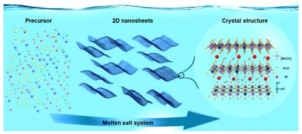 導電聚合物納米片由于其獨特的光學和電學性質而在許多有趣的應用中很有希望。然而,以容易的方式來制造具有大的可擴展性的特征的尺寸和厚度可調的導電聚合物納米片仍然是挑戰。作者開發了一種在單體氣體與CuCl2·2H2O鹽之間的氣固界面上大規模合成各種導電聚合物納米片的新方法。所獲得的聚合物納米片的厚度可以從2.1nm調整到8.8nm。此外,在CuCl2·2H2O膜的表面制備了高導電性,柔韌性和大面積的PPy膜,其透明度為85%。PPy納米片組裝的獨立式電極表現出320 F/cm3的高體積電容和高倍率能力。這種簡便且成本有效的方法可以大量生產導電聚合物納米片,并有望在潛在的實際應用中使用。Large-scale synthesis of size- and thickness-tunable conducting polymer nanosheets via a salt-templated method.(J. Mater. Chem. A, 2019, DOI:10.1039/c9ta08617j)3.Adv. Funct. Mater.:熔融鹽法大規模生產高質量的過渡金屬二硫屬元素化物納米片