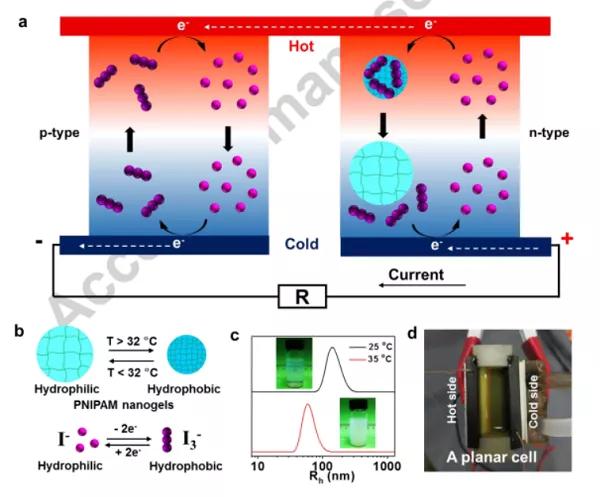 熱原電池(TGC)是將熱能直接轉換為穩定的電力輸出的有前途的設備。目前,由于有限的溫差而產生的低電壓(毫伏級)嚴重阻礙了TGC的實際應用。改善電壓的一種通用策略是交替串聯連接n型和p型氧化還原單元。但是,可能的氧化還原種類的數量受到限制,從而阻礙了器件串聯堆疊的優化。在這項工作中,作者報告了一個新穎的概念,該概念使得能夠通過聚(N-異丙基丙烯酰胺)(PNIPAM)熱敏納米凝膠誘導的碘化物/三碘化物氧化還原對進行pn轉換,塞貝克系數從0.71 mV/K變為-1.91 mV/K。結果證明,納米凝膠能夠在熱側選擇性捕獲I3-,然后在冷側釋放I3-,從而產生游離I3-的濃度梯度,從而導致p-n轉化。此外,我們設計了一種可穿戴設備,該設備由交替的I-/I3-和I-/I3-/納諾格斯串聯構成,通過利用人體熱量產生大約1 V的開路電壓和大約9μW的輸出功率。這項工作開發了一種新的方法來逆轉氧化還原對的塞貝克效應,并且對于擴展TGC中可能的氧化還原物質的庫非常重要。P-N Conversion in Thermogalvanic Cells Induced by Thermosensitive Nanogels for Body Heat Harvesting.(Nano Energy, 2018, DOI:10.1016/j.nanoen.2018.12.073)